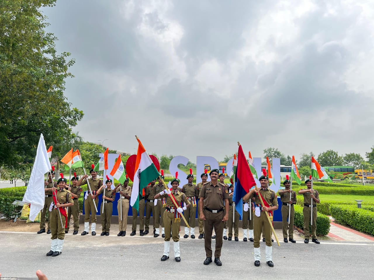 SPSU 30 NCC Cadets participated in Har Ghar Tiranga Rally along with university staff and other students to honour our beloved Tiranga. This instilled values of patriotism, physical endurance, and teamwork — empowering cadets to grow into responsible and resilient citizens of tomorrow. Led by experienced officers and mentors Prof. (Lt.) (Dr.) D S Chouhan , Deputy Dean (SW) and Associate NCC Officer, our cadets participated with unmatched zeal, setting a benchmark for commitment and discipline under the esteemed guidance Hon’ble Vice Chancellor Prof. Dr. Prithvi Yadav. This rally reflects SPSU’s unwavering dedication to nation- building, character development, and holistic education. Here’s to the cadets who inspire us with every step, every salute, and every march! The flags made by the NCC cadets were used in a rally, held from main gate of university to residential areas and back to university premises in the morning of 15/08/2025. On 15/08/2025 awareness campaign done to hoist Tiranga in every residential house and office buildings. The NCC cadets visited each office and residence in the campus distributed the flags and aware them to respect the national flag.