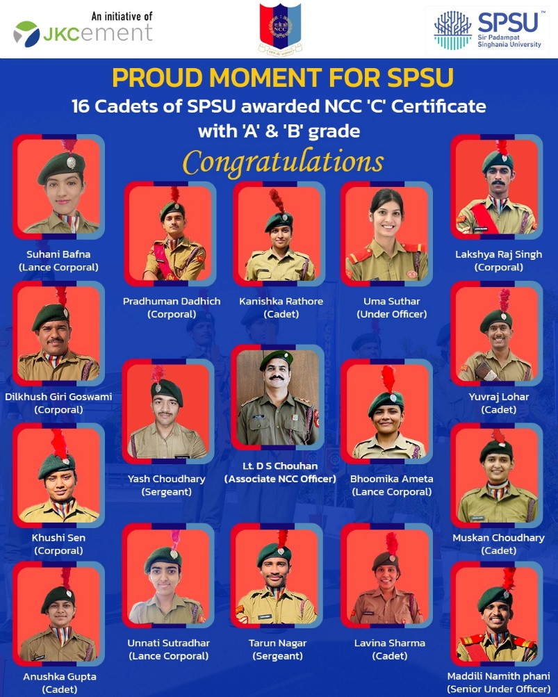 Sir Padampat Singhania University (SPSU), Udaipur, is deeply committed to the holistic development of its students, promoting well-being, strengthening community bonds, and driving societal transformation towards a more equitable society. In this pursuit, the University proudly celebrates the achievement of 16 Senior NCC cadets who successfully cleared the prestigious NCC ‘C’ Certificate Examination held in March 2025. The Honourable President and Vice-Chancellor, Prof. (Dr.) Prithvi Yadav, congratulated the cadets for their dedication, discipline, and commitment to the NCC platoon, while also lauding them for upholding the values of the institution. With this accomplishment, the cadets earn significant opportunities—exemption from the UPSC written examination and a direct call for the SSB interview, along with bonus marks in recruitment examinations for Central and State police services and paramilitary forces. SPSU provides excellent facilities to its NCC platoon, including a firing range and an obstacle course, with rigorous training programmes conducted under the leadership of Prof. (Lt.) (Dr.) D. S. Chouhan, Associate NCC Officer and Deputy Dean, Students’ Welfare. Since 2018, more than 80 cadets from SPSU have earned the ‘C’ Certificate, and over 21 cadets have been commissioned as officers in the armed forces—a testament to the University’s unwavering commitment to nurturing future leaders of the nation.