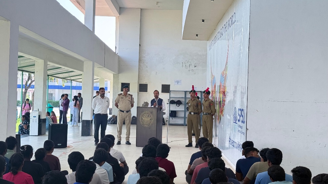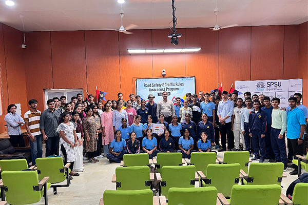 An awareness programme on road safety and traffic rules organized by the NCC cadets of SPSU on August 13,2025. The event took place in the LT-02 and was presided over by Prof. (Lt.) (Dr.) D S Chouhan, Deputy Dean Students’ Welfare at SPSU. CPL Kailash & CPL Rishita served as the anchor for the programme. The primary objective of the awareness programme was to address the growing menace of traffic rule violations and emphasize the necessity of making people aware of the importance of adhering to traffic rules. By promoting awareness and understanding, it aimed to contribute to a safer and more orderly traffic environment inside and outside the campus. The programme commenced with an opening address by Lt. Chouhan, who emphasized the significance of traffic rules and their impact on public safety. He delivered a comprehensive speech on the current scenario of road safety and presented statistical data and examples to underscore the gravity of the issue. He also discussed the legal consequences of traffic rule violations and the importance of obeying traffic laws for the welfare of the community. He also urged the people to obey traffic rules for the welfare of the society. The programme witnessed active participation from the students, teachers, and NCC cadets of SPSU. The event effectively conveyed the message of the importance of adhering to traffic rules and the impact of traffic violations on public safety. The participation of students, teachers, and NCC cadets reflected the collective commitment to creating a responsible and law-abiding community. The programme concluded with a vote of thanks to all the participants, speakers, and organizers.Lt. Chouhan highlighted the role of educational institutions in shaping responsible citizens and expressed gratitude to the Hon’ble Vice Chancellor for granted permission to organise such an important event.