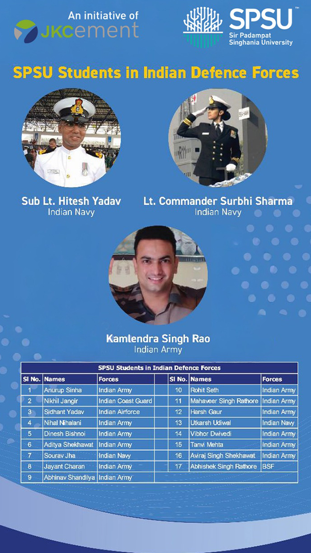 • Lt. (Dr.) D. S. Chouhan, Deputy Dean of Students’ Welfare and Head, Department of Mathematics, Sir Padampat Singhania University, Udaipur, has been nominated as the Contingent Commander for the Rajasthan Directorate NCC at the All India Thal Sainik Camp,which was held at Delhi Cantt from September 2 to 13, 2024.